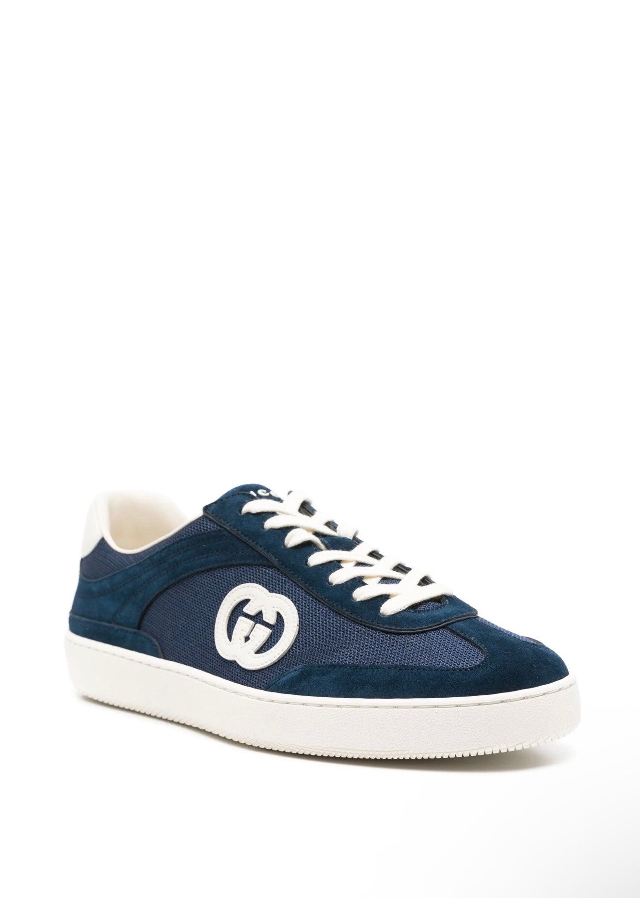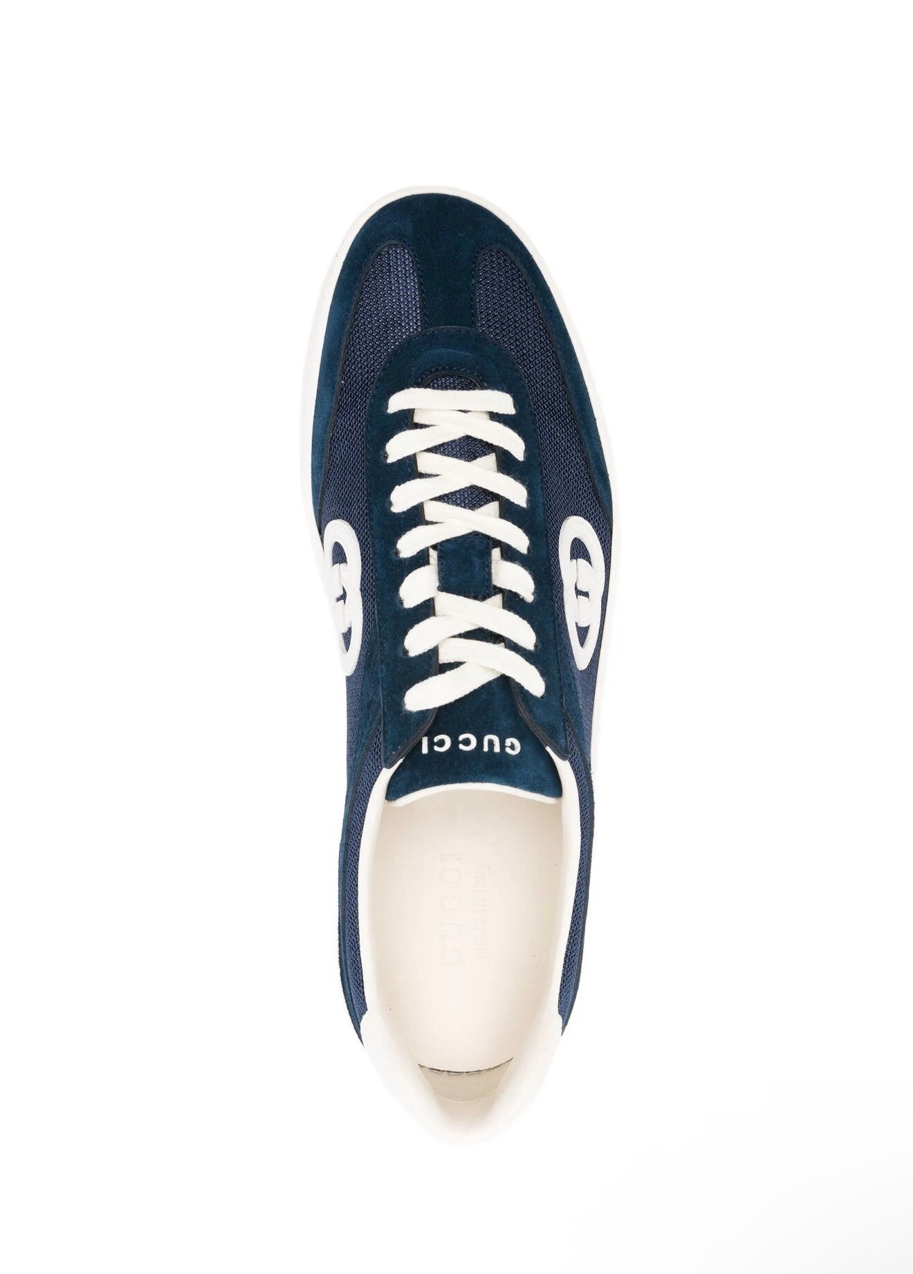 Sneakers Gucci in blu scuro e bianco in pelle scamosciata di vitello con inserti in rete, logo Interlocking G laterale, punta arrotondata, suola in gomma a contrasto e soletta in pelle con logo; modello con lacci e collarino imbottito, include dust bag.
